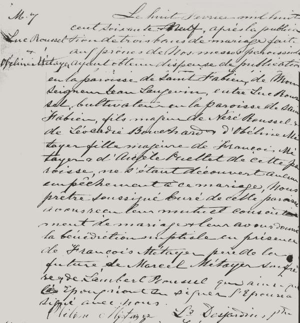 Luc Roussel est né le 8 avril 1833 dans une famille modeste de Rivière-Ouelle. Ses parents, Honoré Roussel et Léocadie Bouchard approchent la trentaine et se sont épousés le 14 février 1831. Ils ont déjà un autre fils, Lambert qui est né en décembre 1931. Nérée possède un lopin de terre pour lequel il paie des cens à la seigneurie. Il possède une vache, un cheval, cinq moutons et deux cochons.