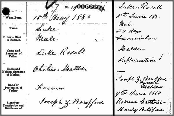 En parcourant les registres d'état-civil de Malden, je tombe sur la déclaration de naissance d'un enfant le 18 mai 1880 nommé Luke Rosell, fils de Obeline Mathilda. Il s'agit évidemment de Obéline Métayer et d'un document rédigé par un anglophone. Cet enfant mourra des suites d'une inflammation 20 jours plus tard.