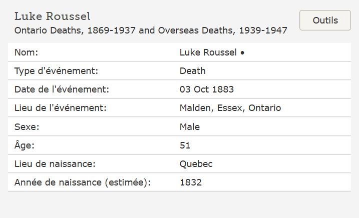 C'est en 1998, que j'ai retracé la famille du petit-fils de Luc Roussel, James-Francis Russell à Laytonville en Californie. Je vous réfère au billet de ce blog intitulé 'Des cousins Roussel en Californie'. Depuis ce contact, je n'ai pas cessé de chercher et chercher les autres membres de cette famille aux États-Unis et ce n'est que récemment que j'ai tombé par pur hasard, sur leur séjour à Malden en Ontario. Mon arrière-grand-oncle Luc et Obéline, sont devenus dans mon cœur, des héros inspirés par leur Foi immense et un courage sans limite.