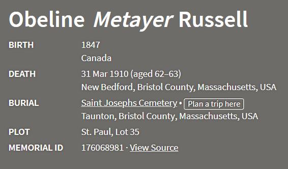 Qu'est-il advenu de cette famille ? J'ai retrouvé leurs traces sur le recensement de 1910 au États-Unis et dans les enregistrements du cimetière Saint-Joseph de Taunton au Massachusett où repose Obéline Métayer depuis son décès le 31 mars 1910 à New Bedford, Massachusett, patrie d'adoption de la famille Russell (Roussel) depuis 1885 soit l'année de son immigration aux États-Unis déclarée par l'ainée Véronique lors du recensement de 1910. Cette famille, devenue monoparentale aura vécu deux années de privations et de sacrifices avant de se retrouver à New Bedford, où ils ont finalement trouvé du travail dans les usines de textiles, certains ayant servi dans l'armée. Tous ont adopté la nationalité américaine et sont morts sans jamais revoir le Saint-Laurent et les côtes du Bic et Saint-Fabien qui les ont vu naître.