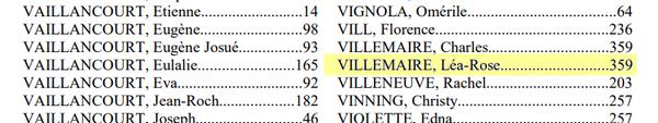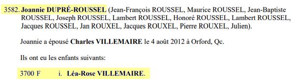 Mon dictionnaire généalogique est très facile à utiliser pour trouver la lignée directe d'une personne jusqu'à l'ancêtre Julien Rouxel. Pour faire une démonstration, nous allons réaliser la lignée directe de mon arrière-petite-fille Léa-Rose Villemaire.