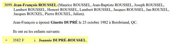 Sur la page 359, nous verrons que Léa-Rose a le numéro de suivi 3700 et est la fille de Joannie Dupré-Roussel dont le numéro de suivi est 3582. Donc, pour continuer à monter dans l'arbre de Léa-Rose, il faut aller voir de qui sa mère est l'enfant.