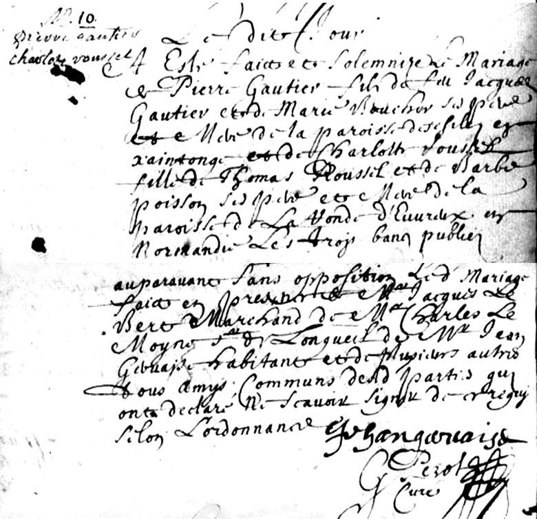 Charlotte Roussel naquit vers 1646 à Évreux en Normandie, du mariage de Thomas Roussel et Barbe Poisson. Elle émigra en Nouvelle-France comme Fille du Roy et elle épousa Pierre Gauthier dit Saguingoira, le 12 novembre 1668. Le contrat de mariage fut reçu par le notaire Bénigne Basset le 3 novembre 1668. Ils s'établirent à Lachine et eurent 8 enfants. Le 4 août 1689, au cours du massacre de Lachine, Charlotte fut prise par les Iroquois et elle est probablement morte en captivité.voir acte de mariage