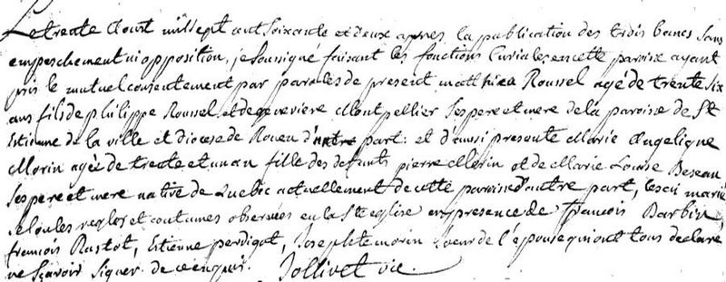 Adrien Roussel, né vers 1724 à Cliponville-en-Caux, évêché de Rouen en Normandie, du mariage d'Adrien et Marie Marchand. Vint au Canada vers 1755 et épousa Catherine Beaudry le 26 septembre 1757 à Montréal.