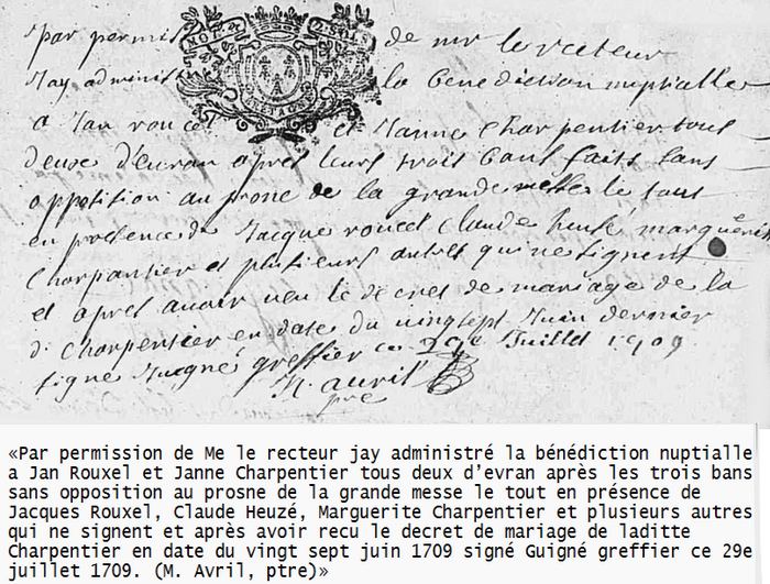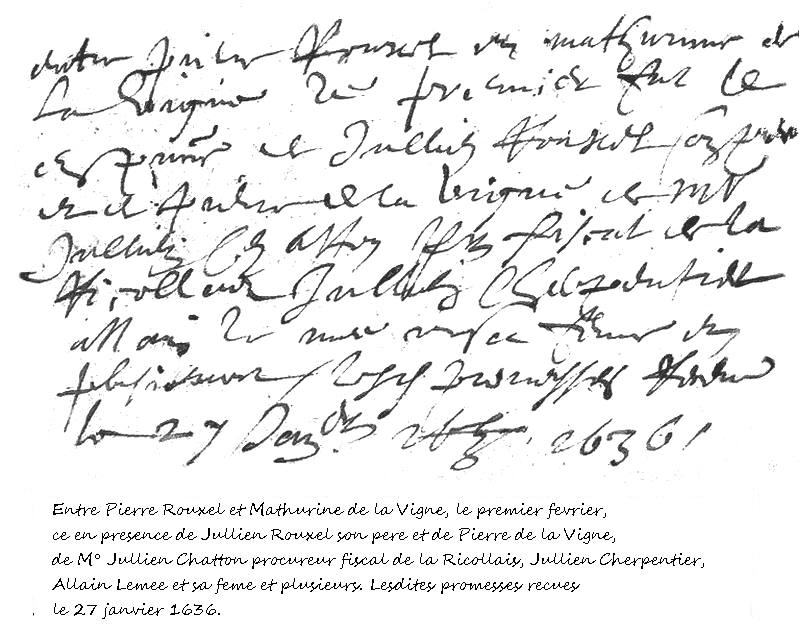 En parcourant les registres pour retracer les ascendants de mon ancêtre Jacques Roussel, il a été possible d’aller aussi loin que Julien Rouxel, dont la famille vivait dans les hameaux de Poncadeuc et de la Cotinais au seizième siècle. Julien eut un fils en 1610, qui s’appelait Pierre. Celui-ci se maria en février 1636 à Mathurine Delavigne, 15 ans, fille de Mathurin et Perrine Basrel, comme en fait foi leur ban de mariage extrait des registres de la paroisse d'Évran.