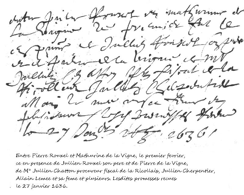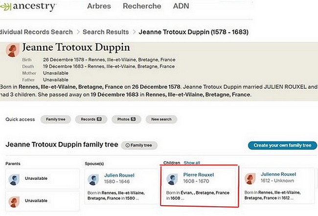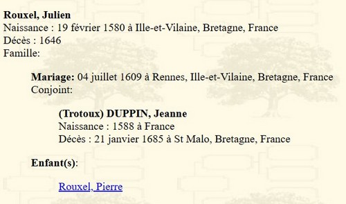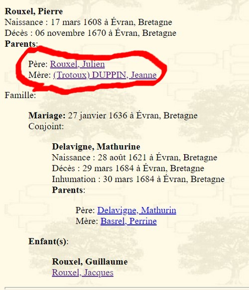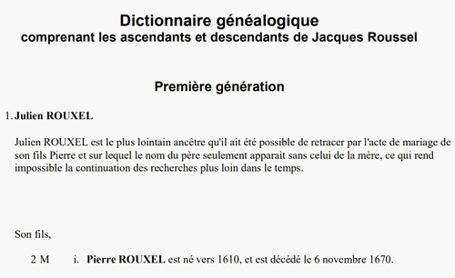 Je demande donc à ceux qui possèdent une base de données ou fichier Gedcom remontant jusqu'à Pierre Rouxel et Mathurine DeLavigne, de corriger cette misérable erreur qui vous fait bifurquer vers un autre arbre qui n'a rien à voir avec notre lignée des descendants et ascendants de Jacques Roussel. Il faut se méfier aussi des données cueillies sur internet qui ne sont pas toujours bien vérifiées avec des actes officiels.